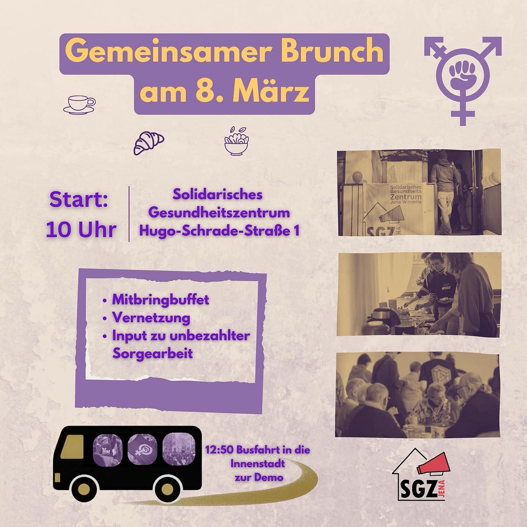 Am 8. März laden wir herzlich zu einem Mitbring-Brunch ins SGZ in Winzerla ein. Gemeinsam möchten wir uns über unbezahlte Sorgearbeit austauschen – also über all die Arbeit, die im Alltag oft selbstverständlich passiert: Kinder betreuen, Angehörige pflegen, zuhören, organisieren, emotional unterstützen, den Haushalt stemmen. Diese Arbeit ist nach wie vor in unsere Gesellschaft häufig unsichtbar und unbezahlt.